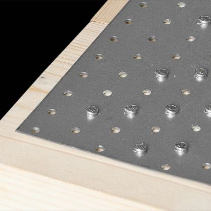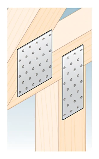 Les plaques perforées sont le plus souvent utilisées pour l'assemblage de fermes de toiture, où elles assurent une liaison durable et stable entre les éléments de chevrons, poteaux et contrefiches. Elles conviennent également partout où un montage rapide et répétable de connecteurs plats est nécessaire — de la charpente de toiture aux structures de pergolas, abris et dépendances. La fixation s'effectue à l'aide de clous annelés d'un diamètre de ø4 mm, qui garantissent un ancrage sûr dans le bois et une exploitation complète de la capacité portante déclarée du connecteur.