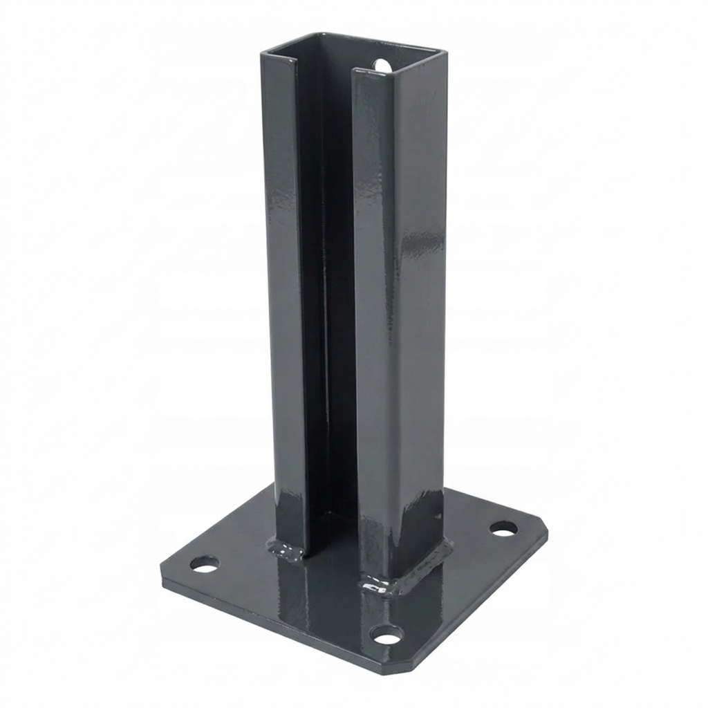 Produit dédié aux poteaux de section 60×40 mm, utilisés dans les clôtures à panneaux. La platine permet un montage rapide et sûr à l'aide de vis ou chevilles pour béton — il suffit de la fixer au support par les quatre trous pré-percés en usine et d'insérer le poteau dans le profilé du support.