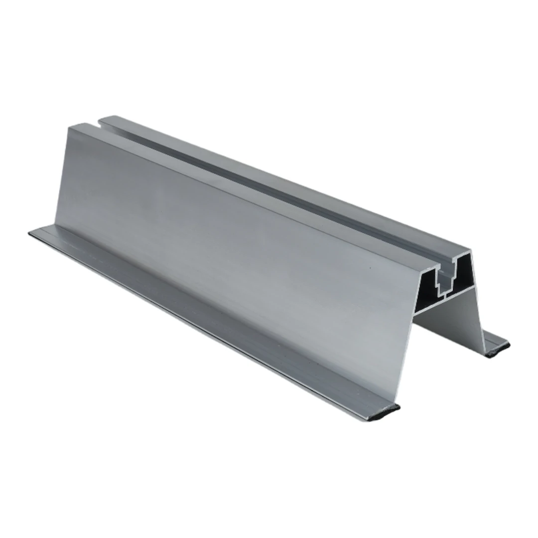 Le profil trapézoïdal en aluminium ou pont trapézoïdal permet de fixer des panneaux directement sur des tôles trapézoïdales. Il convient à la fixation de panneaux photovoltaïques à l'aide d'attaches centrales et d'attaches d'extrémité. Les bornes sont fixées au canal supérieur du rail de montage à l'aide de vis à six pans creux et d'écrous carrés. Le rail de 70 mm de haut permet une libre circulation de l'air sous le panneau, ce qui permet un refroidissement naturel et la séparation du panneau de la surface chauffée du toit.