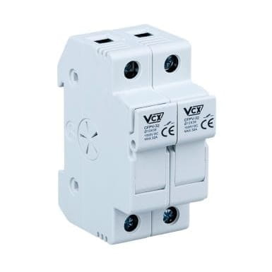 Porte-fusible 2P 32A 10x38 1000V DC CFPV-32 CF PV32 2P VCX conçu pour les cartouches fusibles de dimensions 10x38, destiné à une utilisation dans les installations photovoltaïques. La tension de service maximale admissible est de 1000V DC et le courant maximal admissible est de 32A.