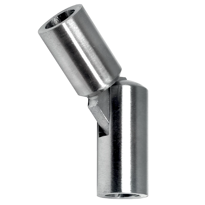 Coude articulé pour barre et tube Ø 12 mm — raccord de balustrade universel en acier inoxydable AISI 304 avec finition satinée. Grâce à la plage d'angle réglable 90°–180°, il convient parfaitement aux constructions d'escaliers, aux brisures et pentes de main-courantes, où un ajustement précis de l'angle est requis sans nécessité de couper ou souder les éléments.