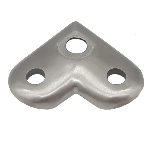 La plaque est destinée à la fixation des supports de main courante sur les angles — là où le parcours de la balustrade change de direction. Le montage s'effectue en vissant la plaque par le haut sur une surface plane (par exemple un poteau ou un pilier porteur). Trois trous de montage assurent une fixation sûre à trois points et éliminent le risque de rotation de l'élément sous charge.