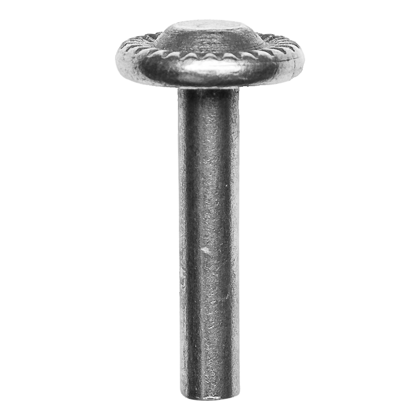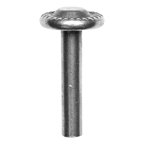 Rivet décoratif en acier Postal destiné à l'assemblage permanent et indémontable d'éléments de structures métalliques avec fonction décorative simultanée. Grâce à la rondelle crantée de la tête, le rivet se fixe solidement dans le matériau et donne à la structure finie un caractère esthétique forgé — idéal pour les portails d'entrée, portillons, panneaux de clôture et balustrades.