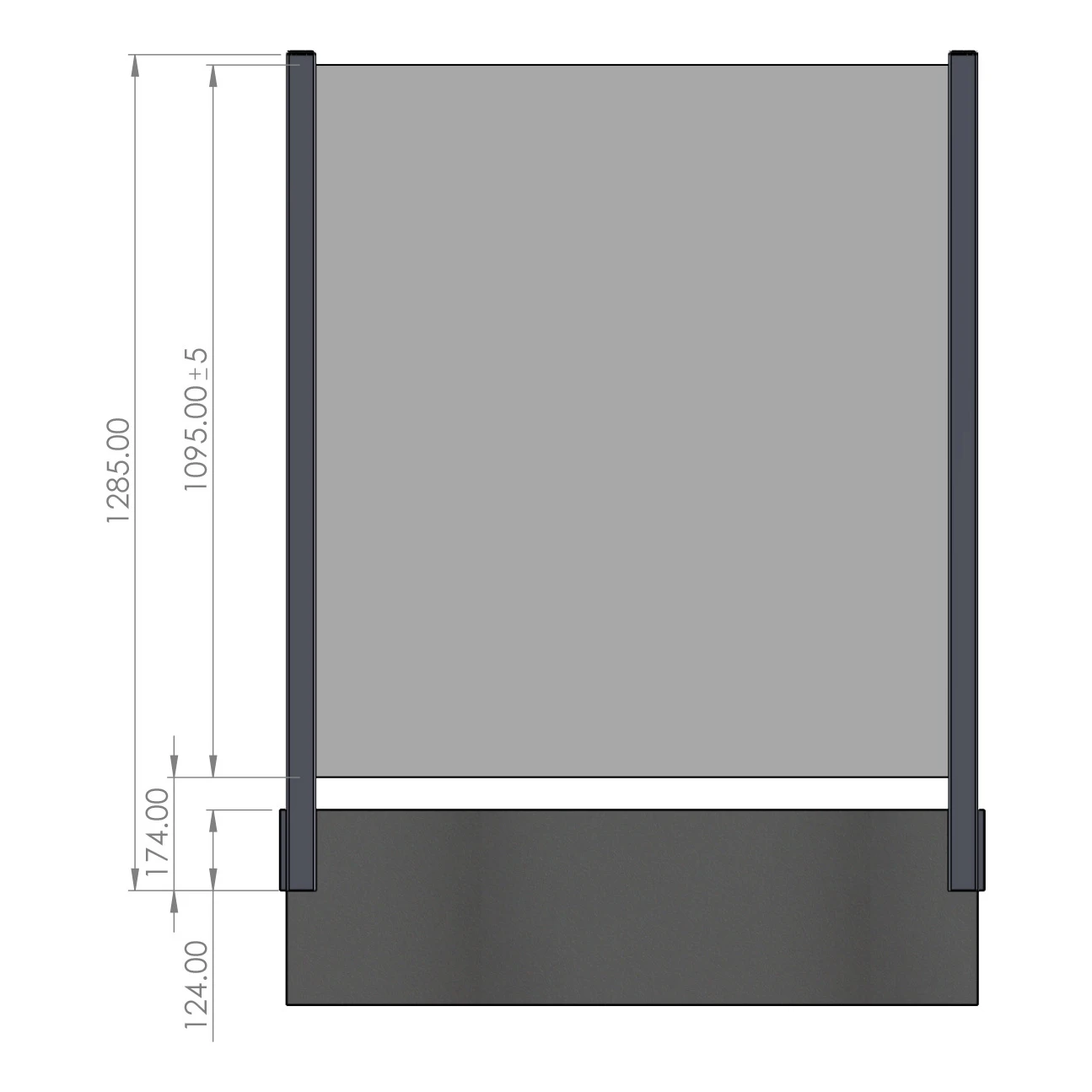 Après montage du poteau avec panneau vitré, la hauteur totale de la balustrade est de 1285 mm. La vitre de hauteur maximale 1095 mm ±5 mm est insérée dans la glissière du profil, et la distance du bord inférieur du poteau au bord inférieur du verre est de 174 mm. La hauteur du cache inférieur (élément de montage) est de 124 mm. Le mode de fixation latérale permet de conserver toute la surface utile du balcon ou terrasse — rien ne dépasse sur la dalle.