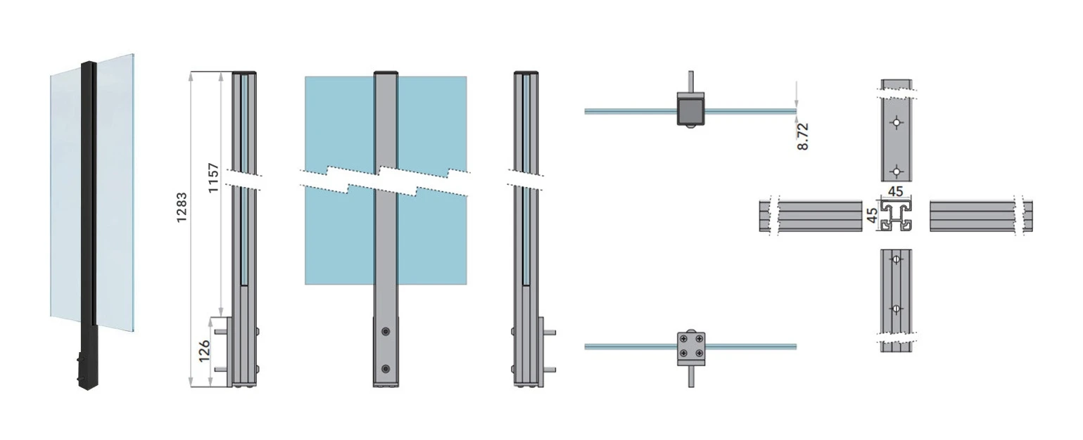 L'instruction de montage comprend 8 étapes simples — de la fixation du profil de montage au mur, en passant par l'installation du poteau sur l'élément de base, jusqu'à l'insertion des panneaux vitrés et la sécurisation par le cache. Grâce au système de fixation latérale sur 4 trous, toute l'installation se déroule rapidement et ne nécessite pas d'outils spécialisés.