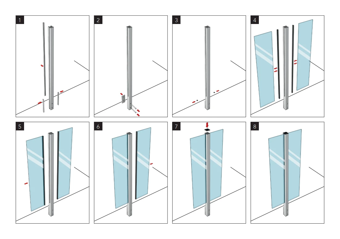Les instructions de montage illustrent 8 étapes consécutives d'installation — depuis la mise en place du profilé et sa fixation à la face de la structure, en passant par l'insertion de la vitre et la pose des joints, jusqu'à la sécurisation avec le capuchon. L'ensemble du processus est simple et intuitif, permettant une réalisation efficace même de grands projets de garde-corps.