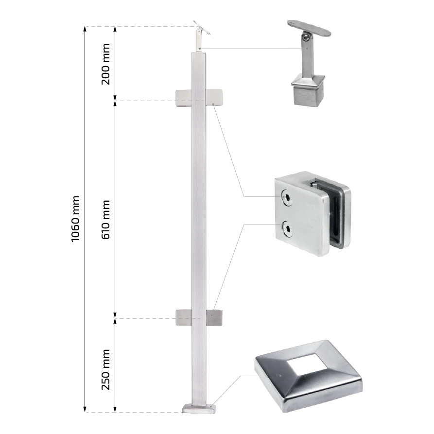 Poteau de balustrade intermédiaire en acier inoxydable AISI 304 de profil 40×40 mm et de hauteur 1060 mm — ensemble complet avec quatre pinces pour verre, support de main courante, cache-base et joints en caoutchouc. La finition satinée confère un aspect élégant et moderne qui s'harmonise parfaitement avec les balustrades de balcons comme d'escaliers. La construction solide et la fabrication précise permettent un montage rapide et professionnel.