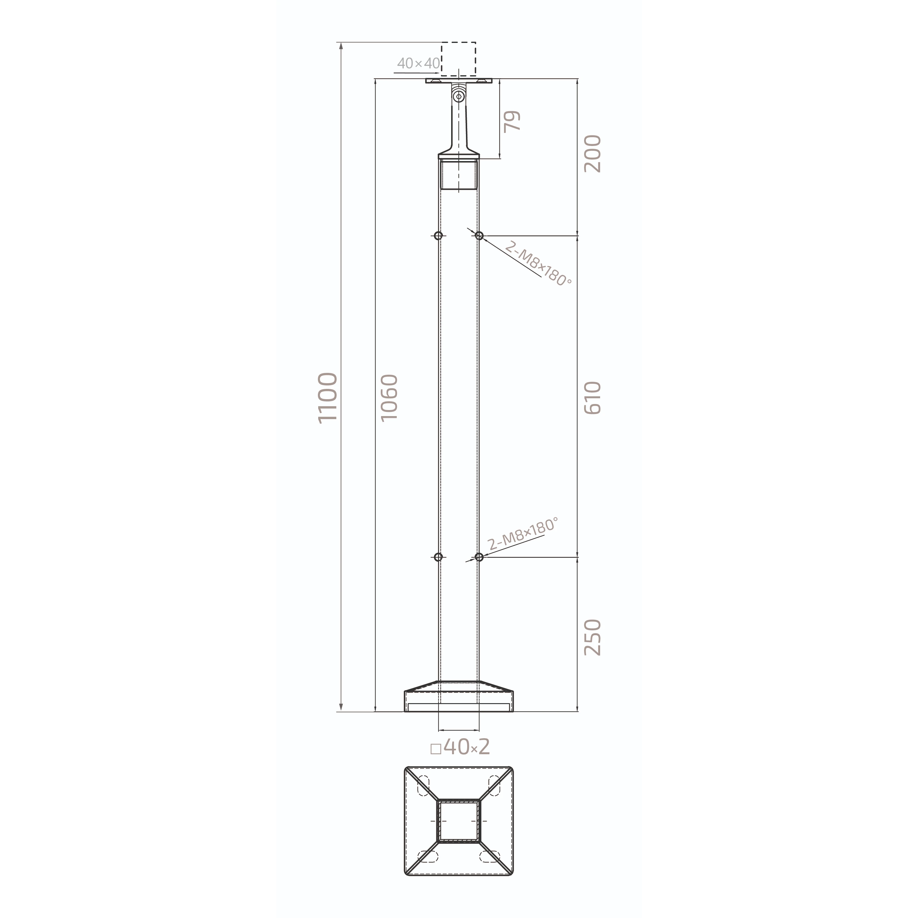 - Poteau intermédiaire avec profil 40×40×2 mm, hauteur 1060 mm