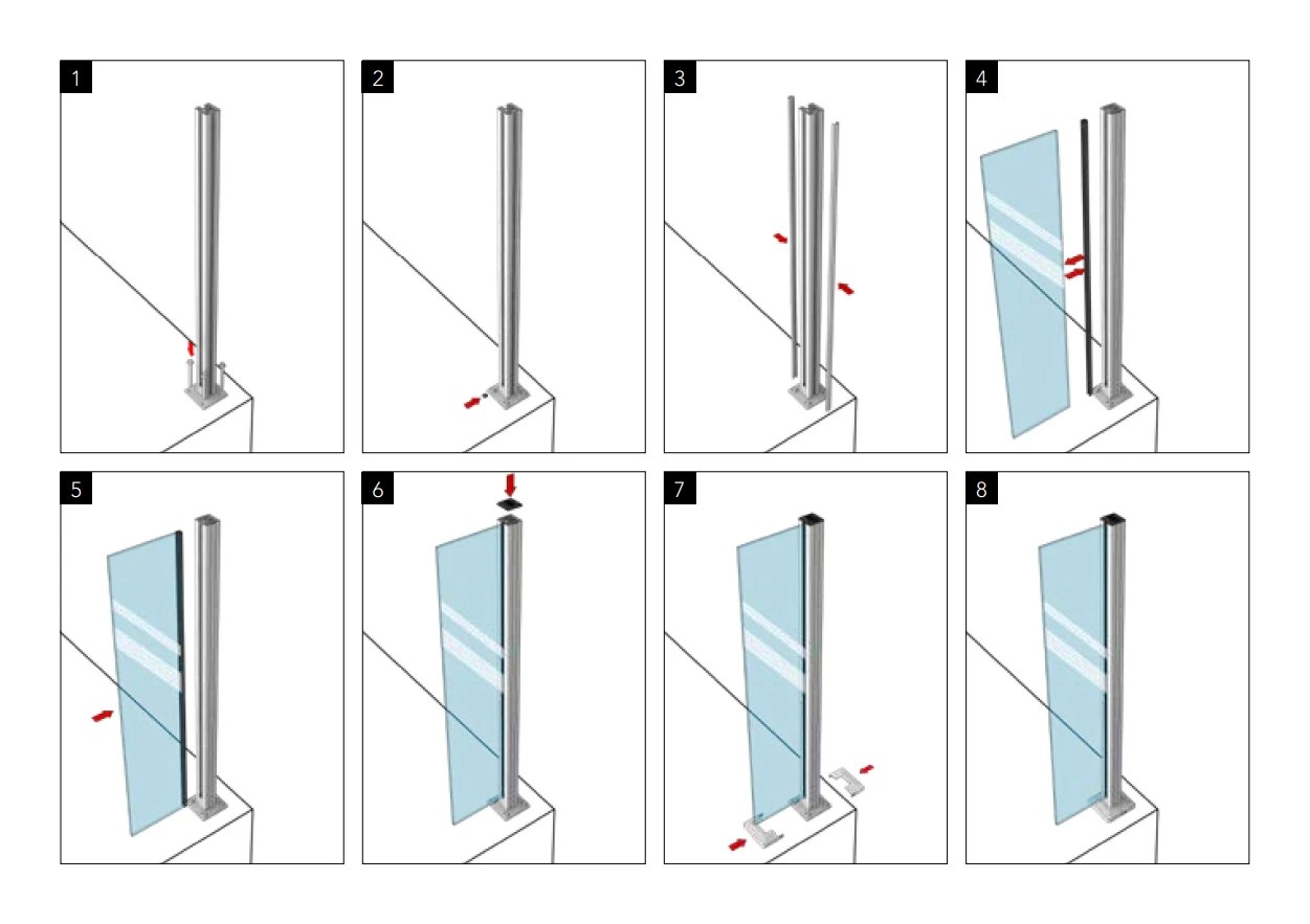Le montage du poteau intermédiaire Kozza est simple et se déroule en 8 étapes — de l'ancrage de la base au sol, en passant par la pose du profil et du panneau de verre, jusqu'au montage du cache et du bouchon. Le système plat intuitif élimine le besoin d'utiliser des outils spécialisés, ce qui réduit considérablement le temps de travail sur le chantier.