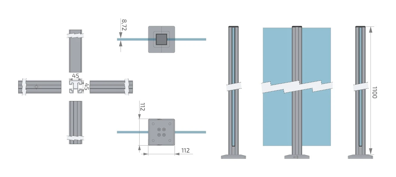 Le profil de section 45 × 45 mm possède une rainure longitudinale précisément adaptée au verre d'épaisseur 8,72 mm (feuilleté sécurit 2 × 4 mm + film PVB). La forme svelte et géométrique du profil assure la stabilité de la construction tout en préservant la légèreté visuelle de l'ensemble de la balustrade.