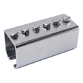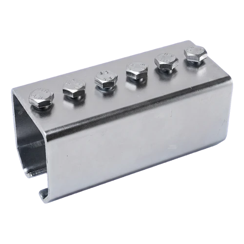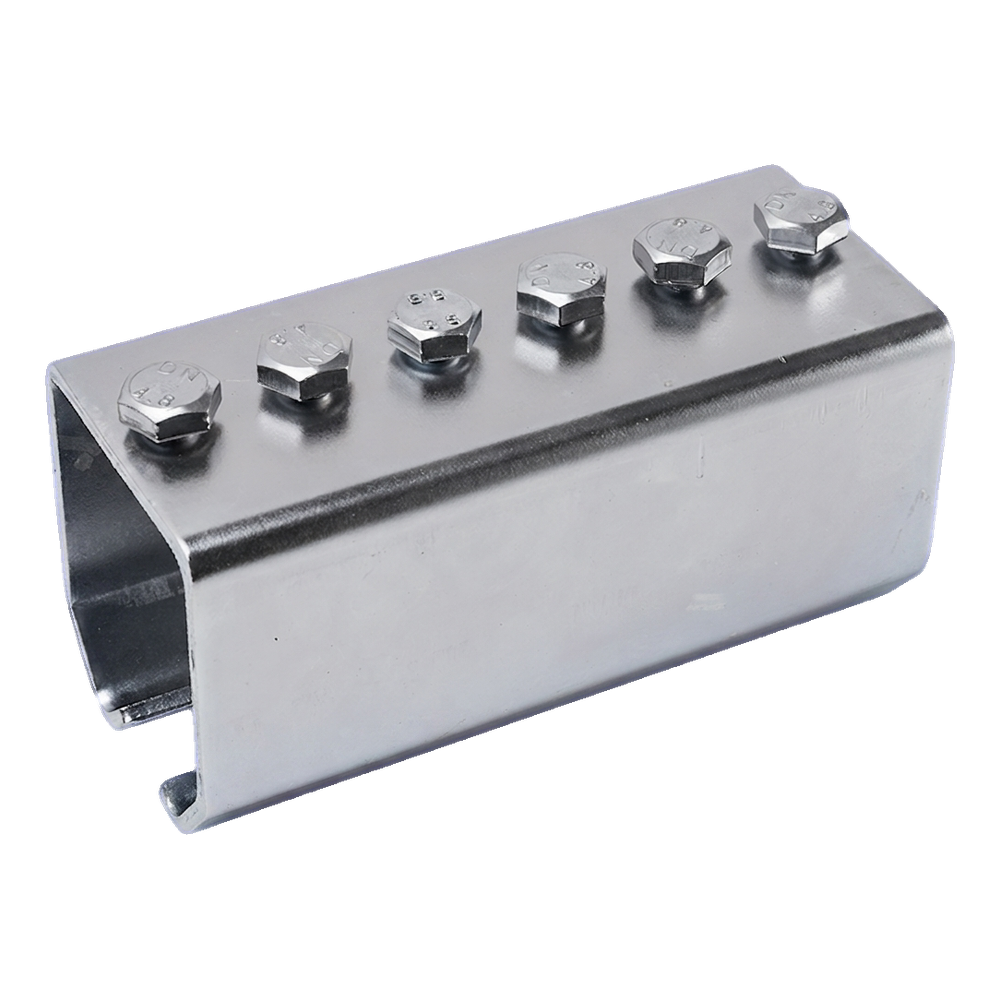 Raccord galvanisé pour rail de guidage de marque PSG destiné à raccorder des sections de profilé en U (rail) de dimensions 59×62 mm, utilisé dans les portails suspendus. La construction solide en acier galvanisé et l'ensemble complet de 6 vis de serrage inclus permettent un montage rapide et sûr sans nécessité de compléter avec des accessoires supplémentaires. Le raccord s'emboîte sur le joint de deux rails pour assurer une liaison rigide et durable, éliminant les jeux et vibrations pendant le fonctionnement du portail.