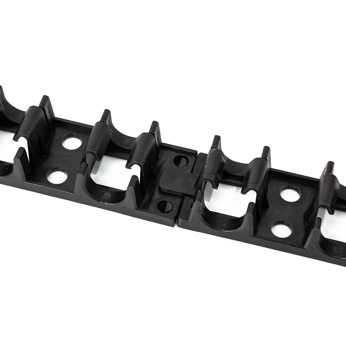 Le rail est également disponible pour les tubes de 10–12 mm et 16–18 mm, ainsi qu'en versions avec adhésif double face — supprimant ainsi la nécessité de percer et de cheviller. En complément du système, une agrafe à un doigt est disponible pour assurer un maintien ponctuel supplémentaire du tube en dehors du rail.