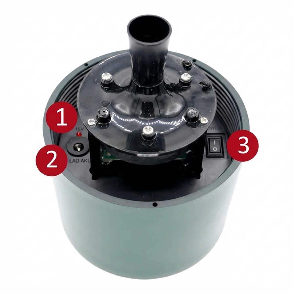 Sur la photo ci-dessus, on distingue les éléments de commande essentiels : 1 – LED de signalisation, 2 – prise ŁAD.AKU pour brancher le chargeur, 3 – interrupteur POWER (I/O).