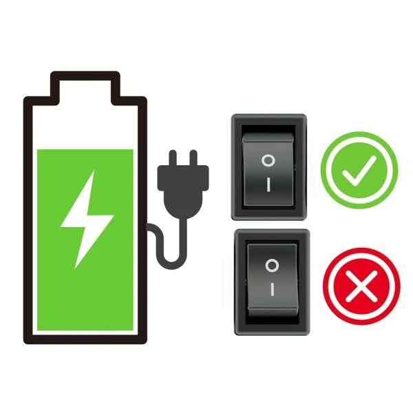 Le contrôle du niveau de charge est tout aussi simple. La LED indique l'état de la batterie : un flash d'1 s toutes les 10 secondes signifie environ 30% d'énergie, et un flash court (~100 ms) toutes les 5 secondes – moins de 10%. Lorsque le chargeur est branché, la LED reste allumée en continu et s'éteint une fois la charge terminée. Attention : la charge ne s'effectue que lorsque l'interrupteur est en position "I" (allumé).