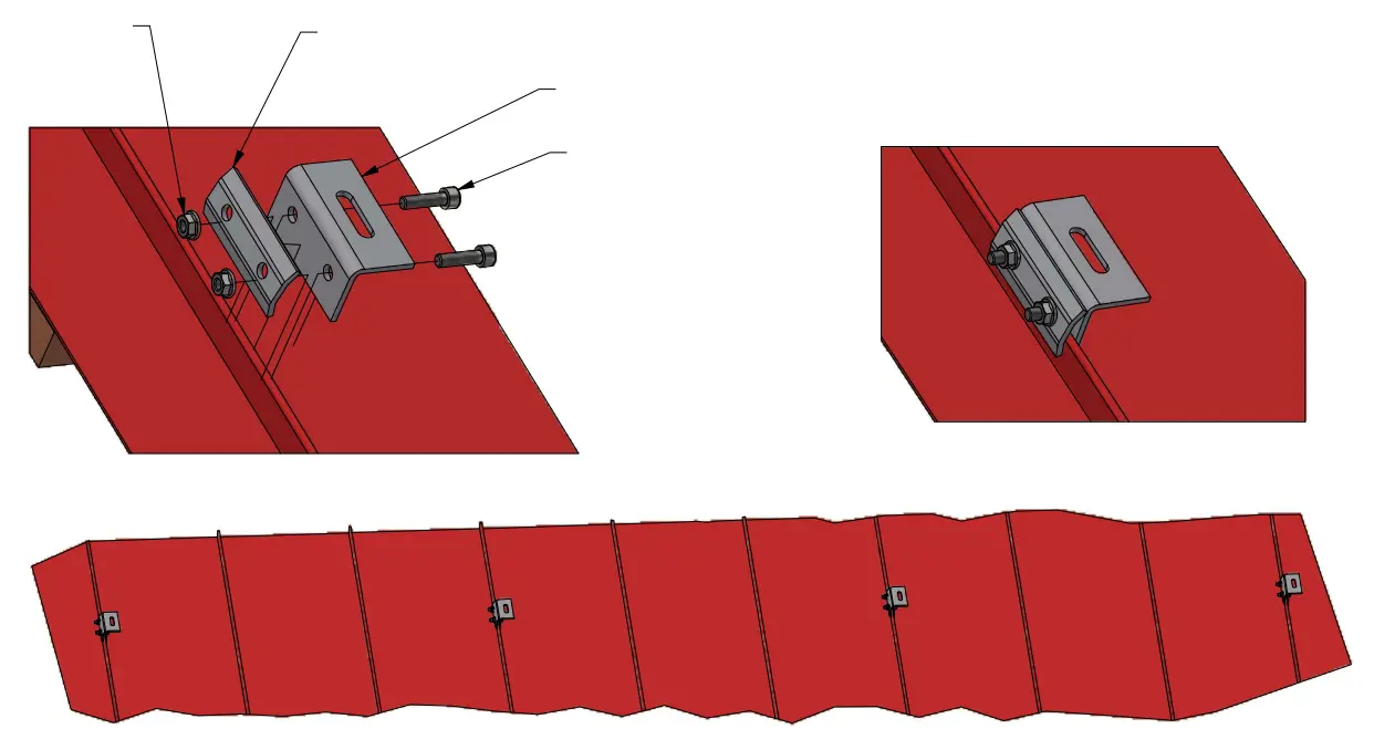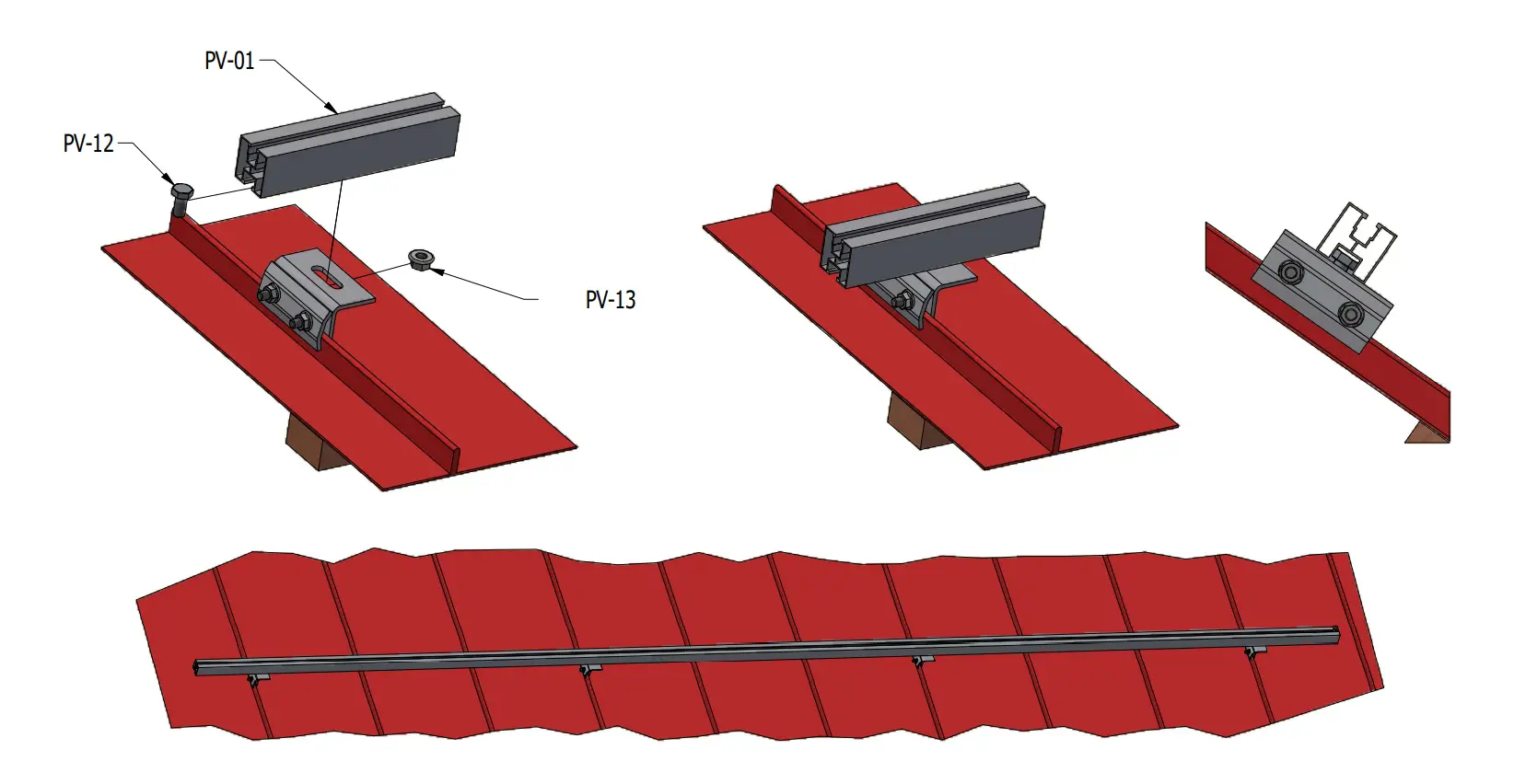 Support de montage pour profilés, installation sur toiture à joint debout. Permet un montage rapide sans nécessité de localiser les chevrons et sans intervention dans la structure de la couverture.