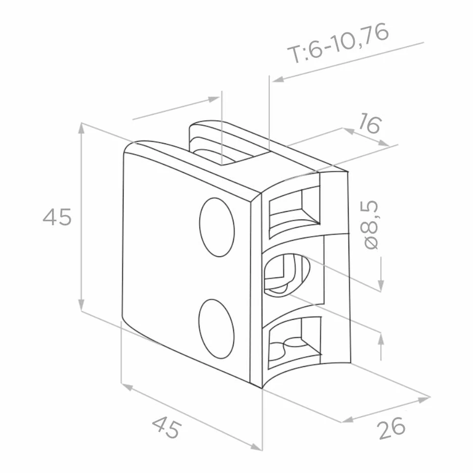 Support de verre rectangulaire 45×45×26 mm en acier inoxydable AISI 316 avec finition satinée. Conçu pour un montage sur tube de diamètre Ø42,4 mm, il s'intègre parfaitement dans les systèmes de garde-corps en verre, aussi bien en intérieur qu'en extérieur. La fixation par vissage assure un ancrage solide et durable sur le poteau.