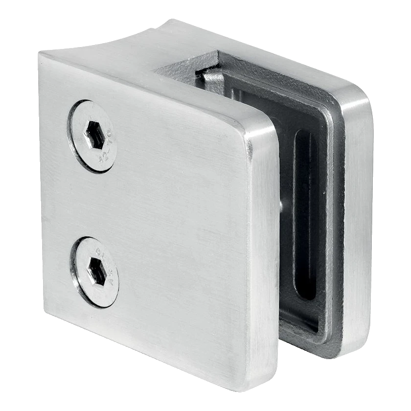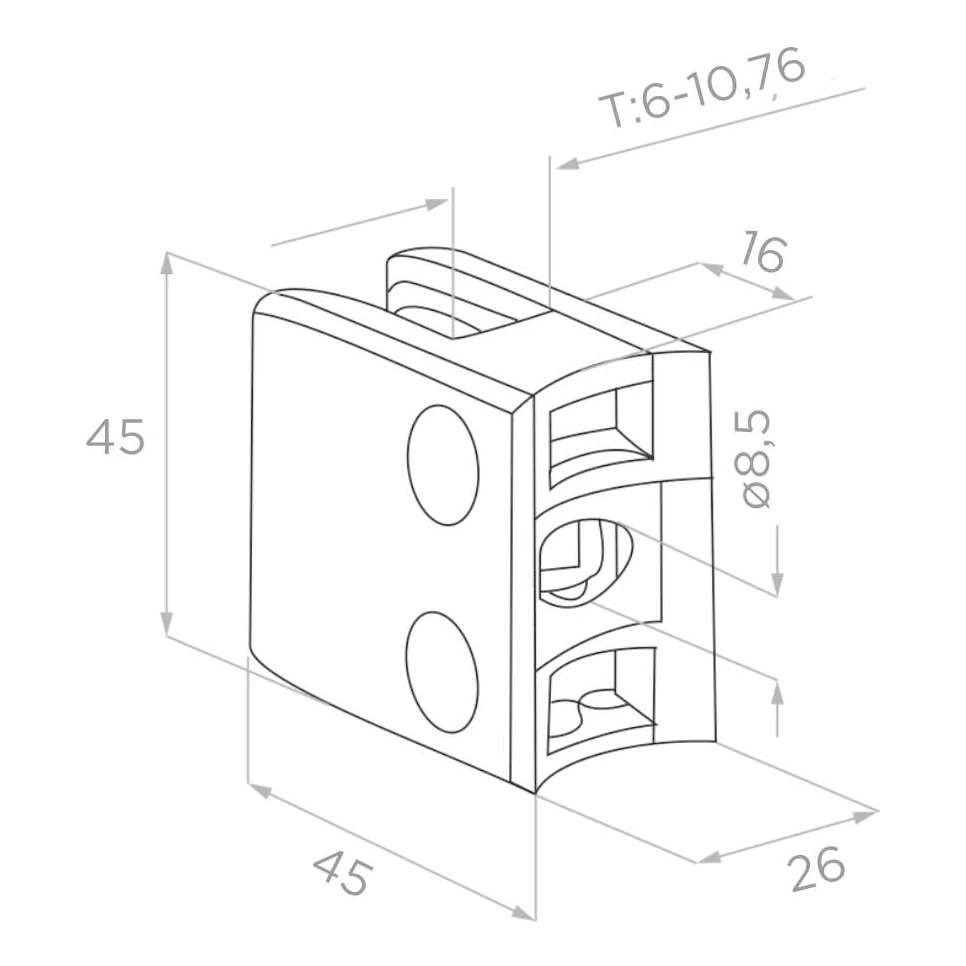 Support de verre rectangulaire 45×45×26 mm en acier inoxydable AISI 304 avec finition polie (miroir). Produit conçu pour la fixation de panneaux de verre d'une épaisseur de 6 a 10,76 mm sur des montants tubulaires d'un diametre de O42,4 mm. Sa construction robuste et sa finition esthétique font de ce support un choix idéal pour les garde-corps en verre, les cloisons et les aménagements intérieurs et extérieurs.