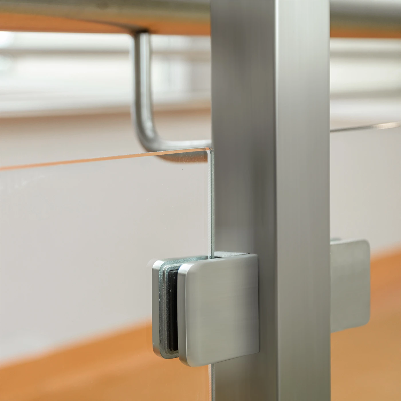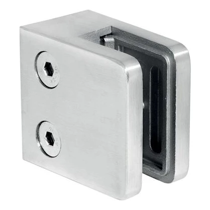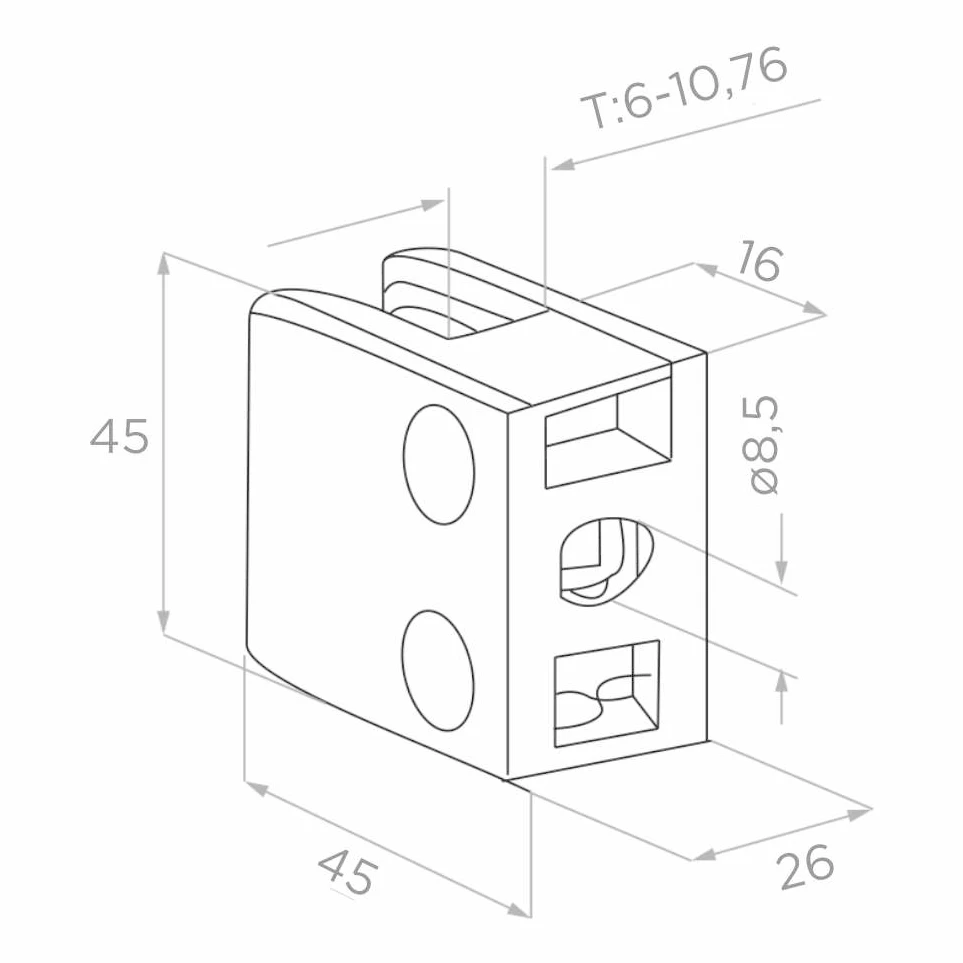 Support de verre rectangulaire 45×45×26 mm en acier inoxydable AISI 304 avec finition brillante/miroir. Conçu pour la fixation professionnelle de panneaux de verre d'une épaisseur de 6 a 10,76 mm sur des surfaces planes. Élément idéal pour les systemes de garde-corps en verre, les cloisons et les aménagements intérieurs — assure une fixation stable et esthétique des panneaux de verre sans perçage du verre.