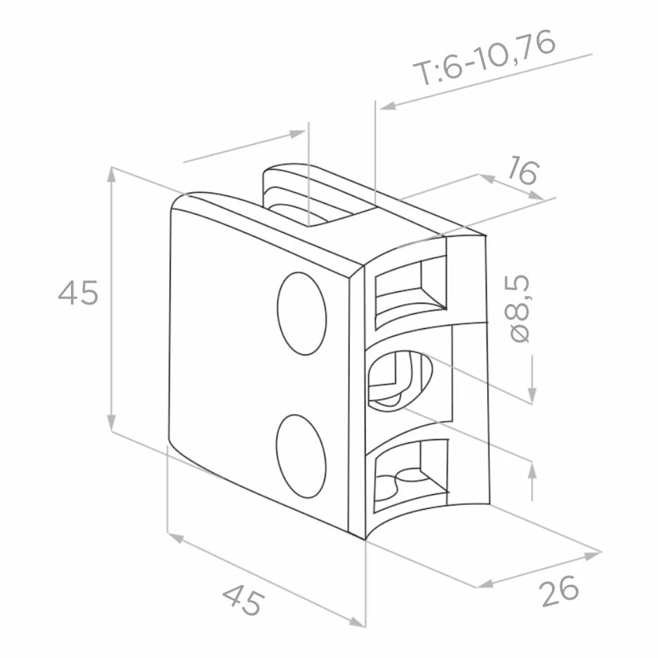 Support rectangulaire pour verre 45×45×26 mm en acier inoxydable AISI 304 avec finition satinée. Conçu pour fixer des panneaux de verre d'une épaisseur de 6–10,76 mm sur des poteaux tubulaires d'un diametre de 48,3 mm. Le produit est monté par vissage — il assure une fixation stable et esthétique des panneaux de verre dans les garde-corps et les cloisons.