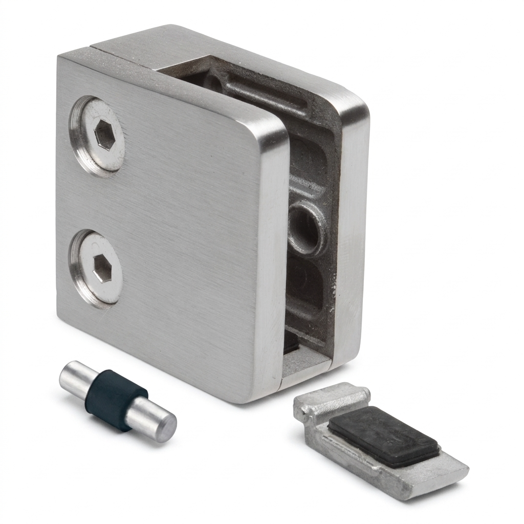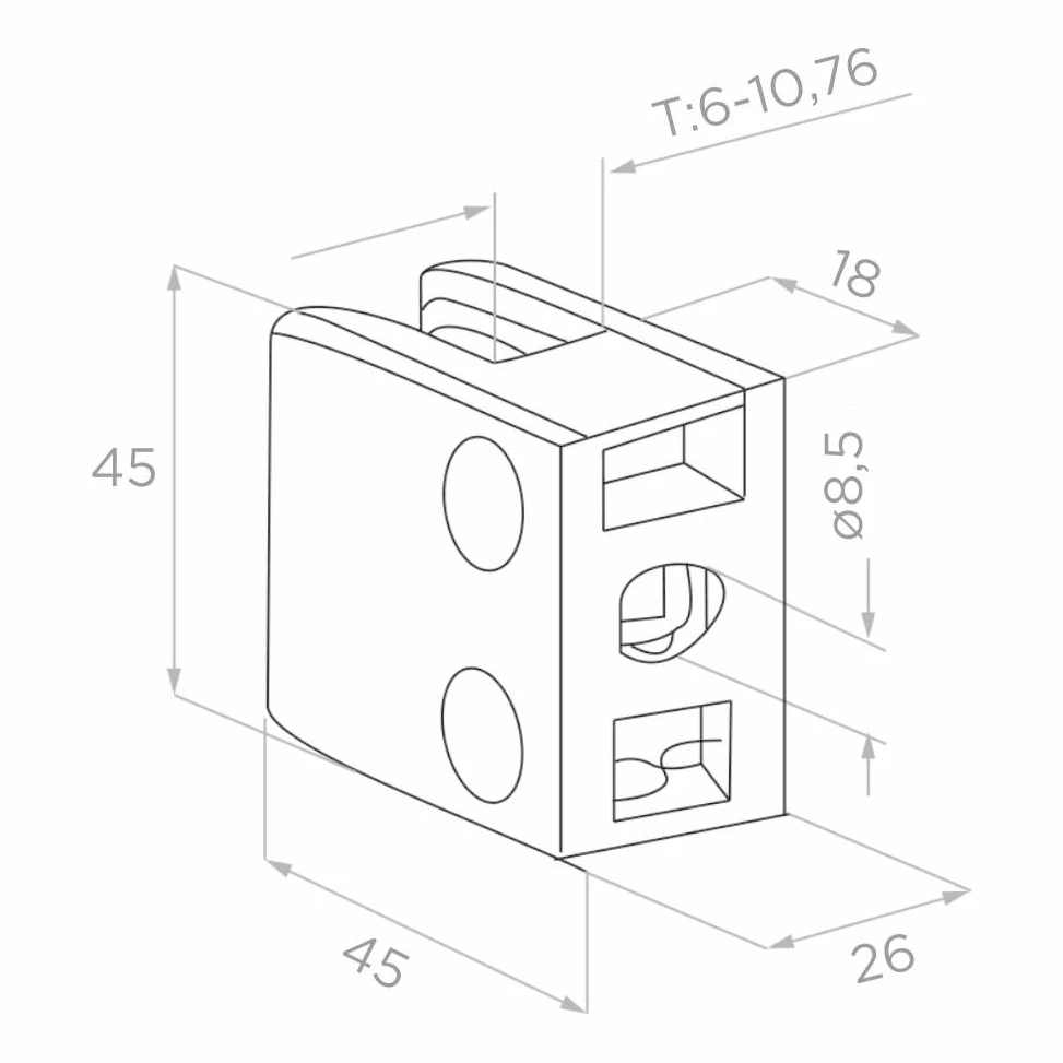 Support pour verre 45×45×26 mm avec équerre et goupille de sécurité — solution de fixation robuste pour le montage de panneaux en verre d'une épaisseur de 6 à 10,76 mm. Fabriqué en acier inoxydable AISI 304 avec finition polie (miroir), il offre une esthétique soignée et une excellente résistance à la corrosion. Conçu pour le montage sur surfaces planes — idéal pour les garde-corps, les pare-vents et les cloisons en verre.