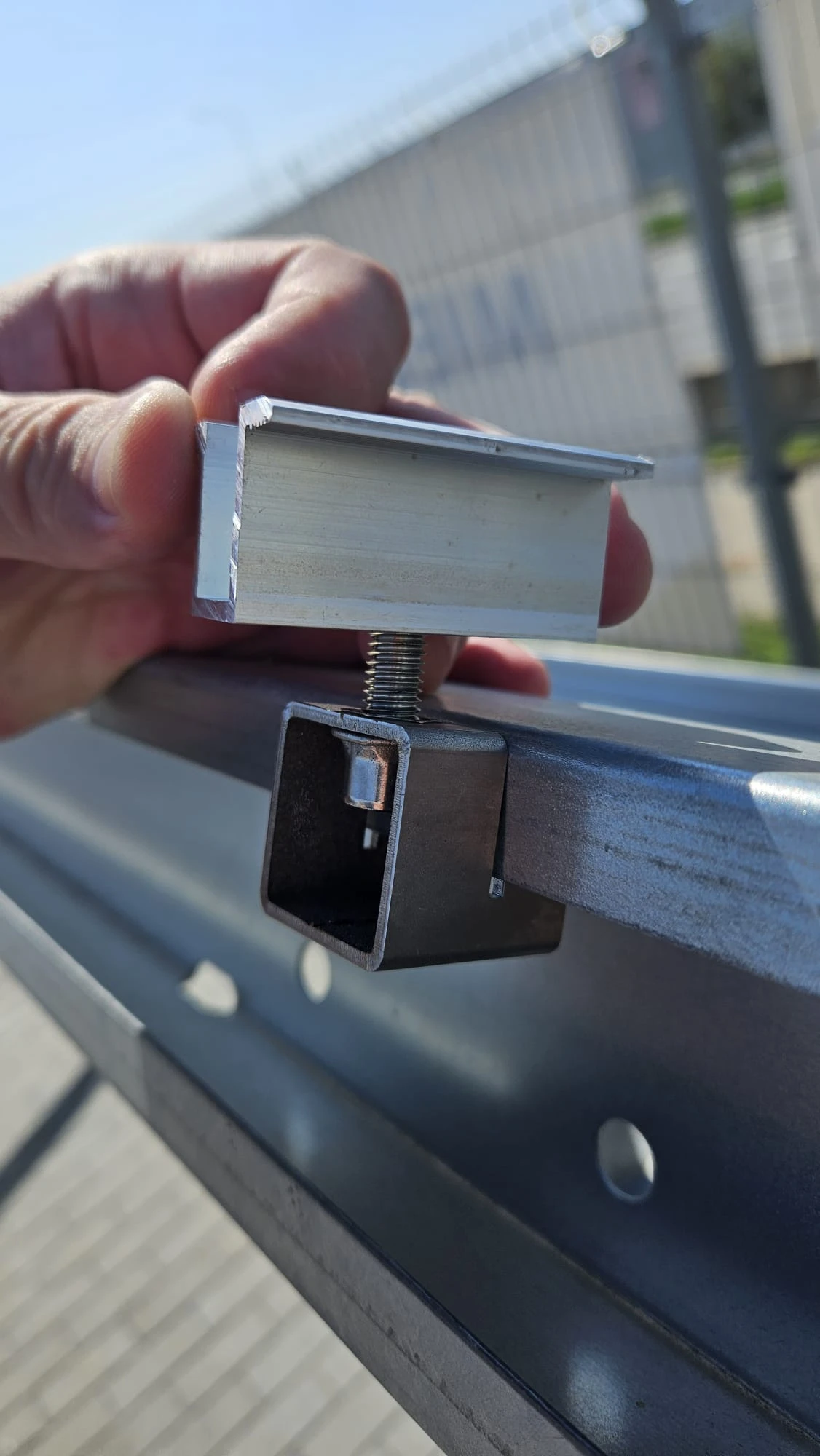 Le support est glissé sur le bord de la panne, puis serré avec une vis M8 passant par le logement fileté intérieurement. Le point de montage ainsi préparé accepte n'importe quelle pince — latérale ou centrale — ce qui donne à l'installateur une liberté totale de positionnement des modules PV.