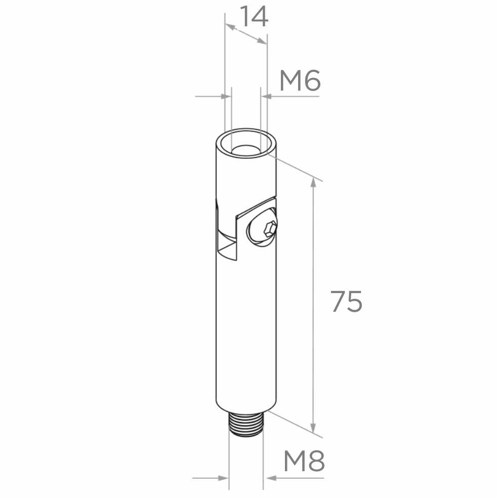La tige possède un filetage extérieur M8 (partie inférieure — pour le vissage dans le poteau) ainsi qu'un filetage intérieur M6 (partie supérieure — pour la fixation du support de main courante), ce qui assure une application universelle et une compatibilité avec une large gamme de systèmes de balustrade.