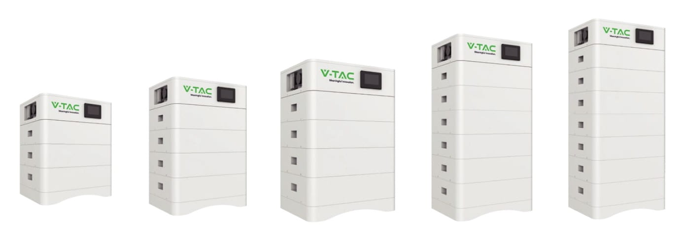 Stockage d'énergie modulaire haute tension V-TAC OHS20K-100 d'une capacité de 20,48 kWh. Base + (4*5,12kWh) VT-OH-5K LiFePO4 5,12V 100Ah modules de batterie + module de contrôle BMS avec câblage inclus.