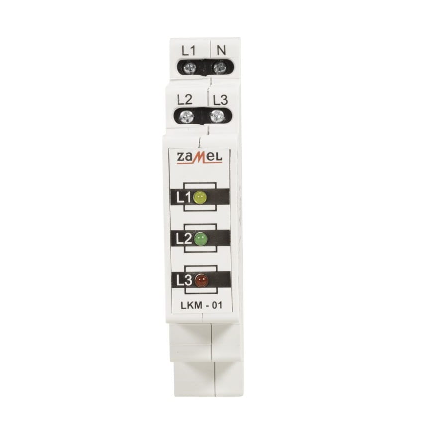 Il est doté de trois diodes électroluminescentes à haute luminosité, étiquetées L1, L2, L3. Un autre avantage du modèle LKM-01-40 est qu'il peut être utilisé dans un réseau triphasé TN, c'est-à-dire un réseau avec un conducteur N neutre. L'unité est montée sur un rail TH 35, ce qui permet de l'adapter à des applications non standard. Le boîtier à module unique et les éléments lumineux durables garantissent un fonctionnement durable et fiable de l'indicateur.